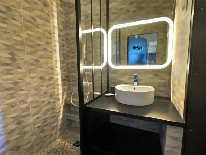 Badkamer: douche, wastafel en toilet.